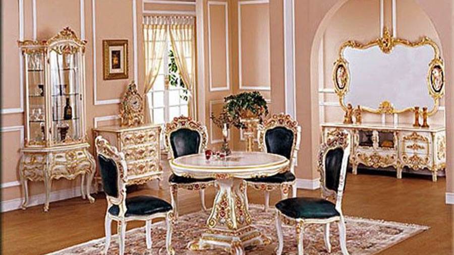 أما أنواع الأقمشة والمواد المستخدمة فيه، المخمل، البورسلان، الخشب اللمّاع، والمعادن المغطسة بالذهب.