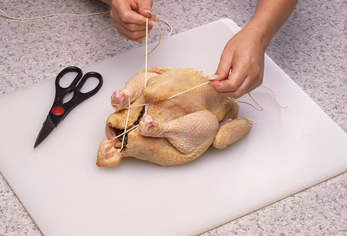 تضبيط الدجاج قبل وضعه بالفرن ليس أمرًا يفعله الطهاة الكبار للعرض فقط (فبالرغم من أننا سنقر بأن ربط أرجل وأجنحة الدجاج مع باقي أجزاء جسمها يجعل الشكل النهائي للطبق مثاليًا)، والسبب العملي هنا لهذا الربط هو لمساعدة الدجاجة على أن يتم طهيها بشكل كامل وجيد وإبقائها رطبة، وإذا لم يتم فعل ذلك فسوف تجف الدجاجة بشدة ولن يتم طهي أرجلها وأجنحتها بشكل جيد.