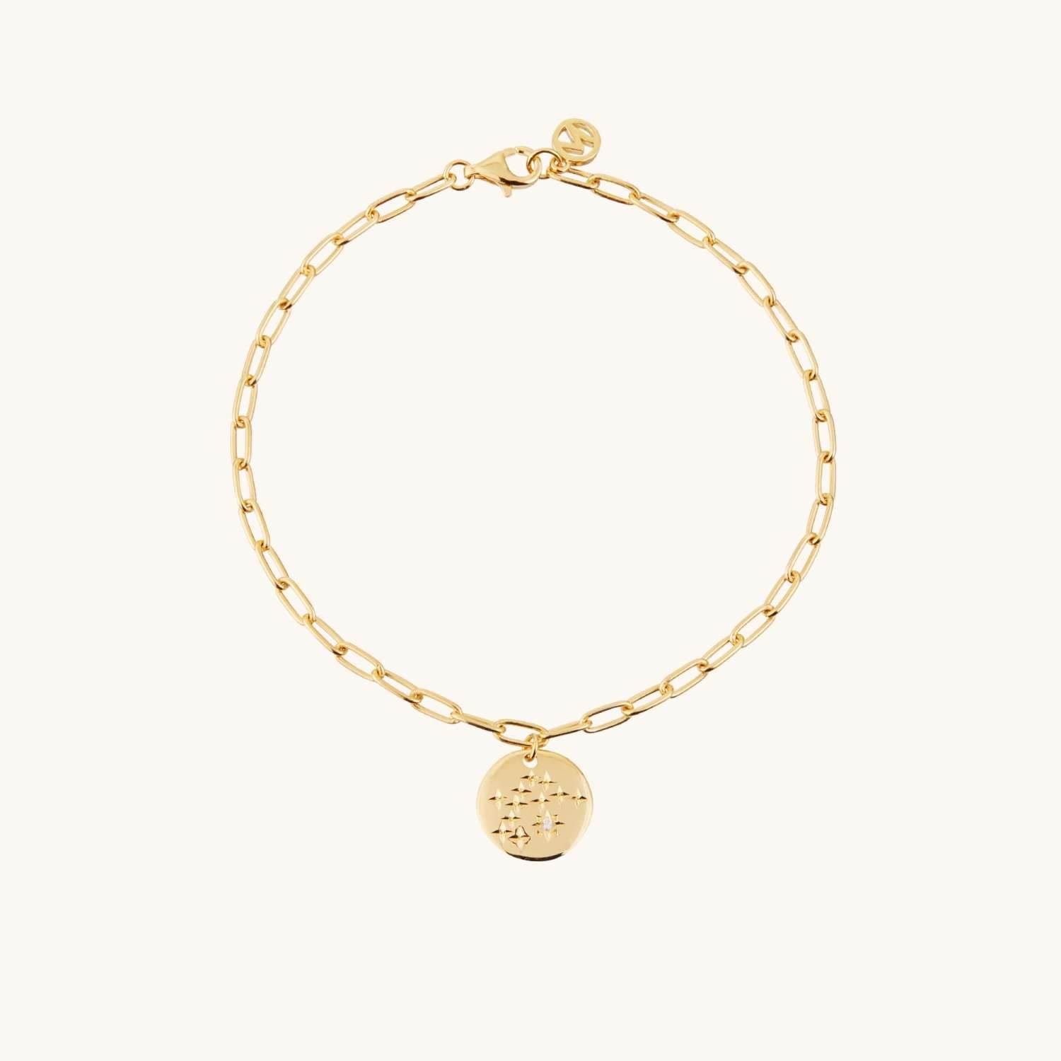 القلادة على شكل عملة ذهبية عليها رمز التنجيم ومتوفرة بسعر 65$، لدى gorjana.com.