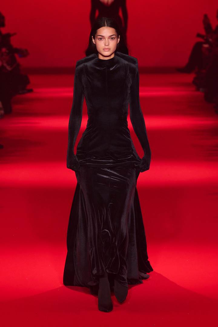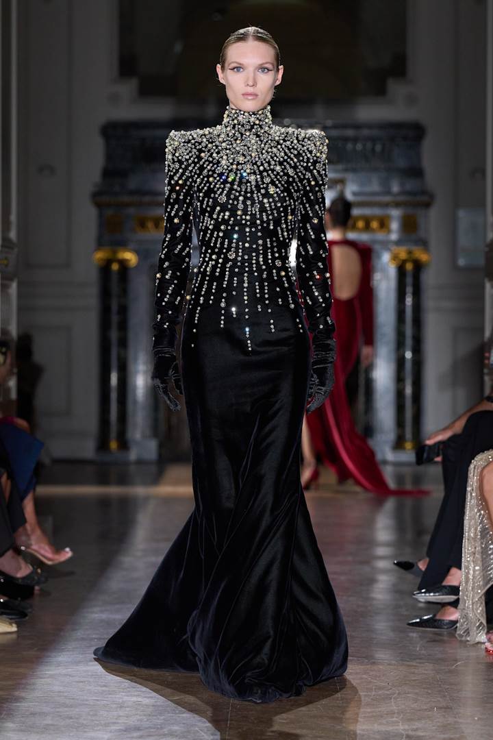 رصدنا في مجموعة المصمم زهير مراد Zuhair Murad فستاناً رائعاً مصمماً من المخمل الأسود على شكل حورية البحر، وقد تميز بياقته العالية والتطريز فائق الدقة الذي زيّن القسم العلوي منه، التصميم الذي زود بقفازات من نفس الخامة واللون، ننصحك بتنسيقه مع توربان ساتان أسود، وانتعلي حذاء أسود سادة، واحملي حقيبة كلاتش فضية صغيرة.