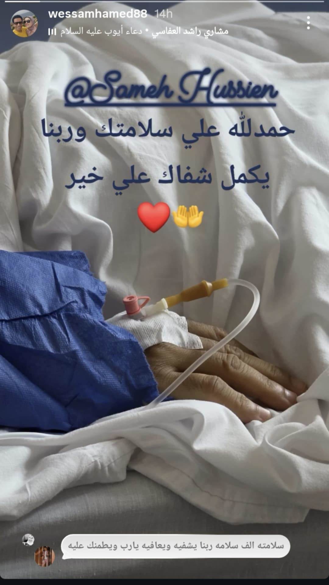 نشرت وسام عبر ستوري حسابها الشخصي على موقع الصور والفيديوهات إنستغرام صورة ليد زوجها وهو في المستشفى ويتلقي المحاليل الطبية، وكتبت تعليق قالت فيه: "حمد لله على سلامتك، وربنا يتم شفاءك على خير"، وتفاعل عدد كبير من محبي سامح مع هذه الصورة وتمنوا له الشفاء العاجل وأن يعود لمنزله ويمارس حياته بشكلٍ طبيعي.