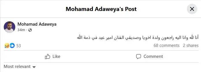كشف الفنان المصري محمد عدوية عن الخبر الحزين عبر حسابه في منصة "فيسبوك"، وكتب: إنا لله وإنا إليه راجعون، والدة أخويا وصديقي الفنان أمير عيد في ذمة الله.