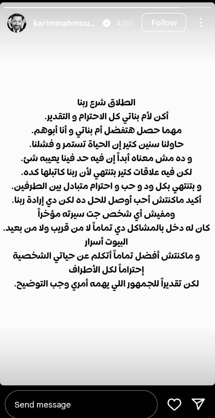 "الطلاق شرع ربنا.. أكن لأم بناتي كل الاحترام والتقدير، مهما حصل هتفضل أم بناتي وأنا أبوهم، حاولنا سنين كتير إن الحياة تستمر وفشلنا، وده مش معناه أبدًا إن فيه حد فينا يعيبه شئ، لكن فيه علاقات كتير بتنتهي لأن ربنا كاتبلها كده، وبتنتهي بكل ود وحب واحترام متبادل بين الطرفين".