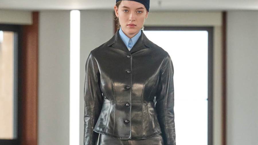 من بين أبرز القطع هذا الموسم، قدّمت دار بالي جاكيت جلدي ببنية واضحة وكتفين محددين وقصّة نحتت الجسم بطريقة أنيقة.
