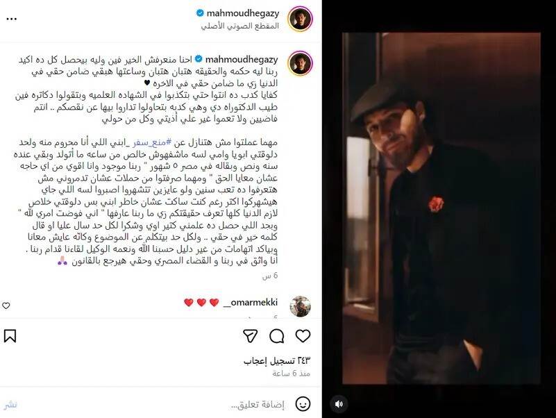 الفنان محمود حجازي: "لن أتنازل عن منع سفر ابني"