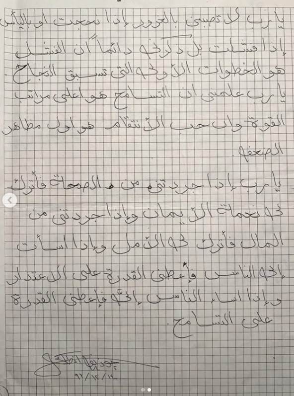 وعلقت على الخطاب قائلة "سأسمح لنفسي بنشر رسالة سابقة منك إلى السماء.. كانت من أحب الصلوات إلى قلبك".