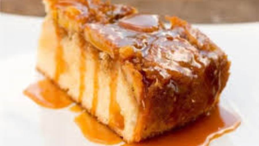 - بطني قالب الكيك بورق الزبدة، وصبي خليط الكراميل، ووزعيه بقاع القالب.