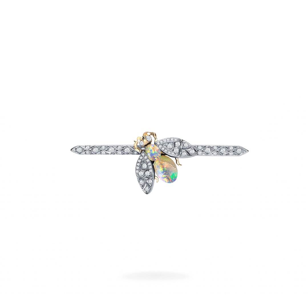 صنع البروش من الذهب الأبيض عيار 18 قيراطاً، وتتصدره حشرة من الأوبال المتوهج تبدو نابضة بالحياة، فيما تتلألأ أجنحتها المرصعة بالألماس كأنها تلتقط ضوء النهار في لحظة ربيعية خاطفة.