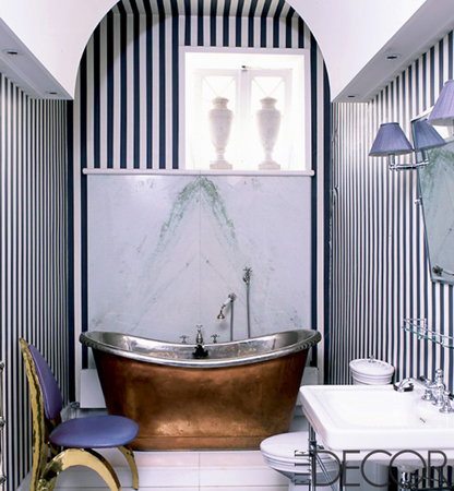 نجد هنا حوض استحمام foodted tube تقليدي محاط بجدران ملونة علي شكل شرائط، مما يجعل لهما شكلاً مرحاً ولطيفاً؛ فالشرائط الرأسية تخلق نوعاً من الإحساس بالارتفاع وتعزز الشكل الدرامي للمكان.