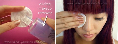 - أحضري قطعة من القطن وضعي فوقها كمية من المزيل ثم ضعيها فوق عيونك للحظات قليلة حتى يذوب الصمغ وتنزلق الرموش المستعارة تماما وبدون ألم ليس هناك داع لجذبها، فقط بلطف قشري أي صمغ متبقي فوق الرموش المستعارة.
