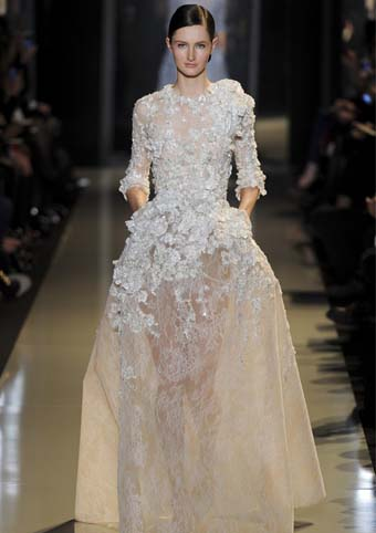 افتتح "إيلي صعب" عرضه بفستان أبيض تحت الركبة مع الدانتيل المتدفق على النسيج الشفاف، جاءت بعده أثواب من الأنسجة المتينة المزينة بالدانتيل والتطريز البراق.