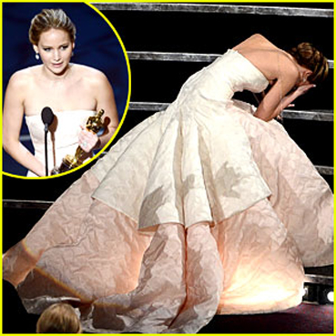 يبدو إن النجمة الشابة جينيفر لورانس قد احترفت السقوط والتلعثم أمام الكاميرات وأثناء وجودها في حفل الأوسكار.