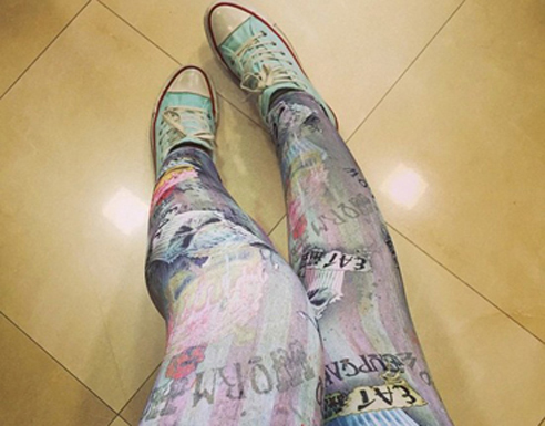 حيث اختارت ميريام فارس بنطال مجنون بنقشات وكتابات عصرية مع حذاء رياضي عوضاً عن أحذية الكعب العالي التي اعتدنا ميريام فارس بها.