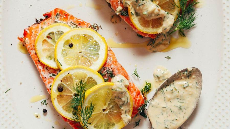- يوضع مكعب من الزبدة مرة اخرى الى الصوص مع العسل الابيض و يقلب حتى يمتزج و يتجانسلتجهيز السلمون: