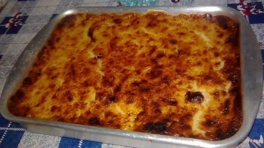 * يوضع الخليط في صينية مدهونة بالسمنة أو الزيت