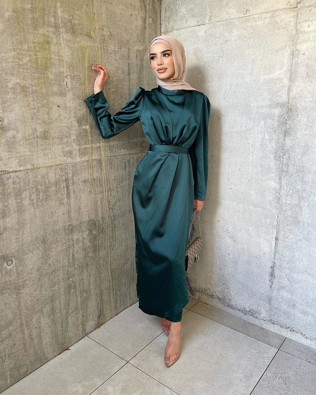 انتشرت موضة الفساتين السواريه المصممة من الساتان وهى الأنسب للعروس التي تفتش عن إطلالة ناعمة لحفل خطوبة وسط العائلة بالمنزل، ارتدي الفستان الأزرق الرويال ذي الياقة العالية والتنورة الواسعة محددة الخصر والمصمم بأكمام منتفخة مع توربان أبيض وأقراط متدلية مرصعة باللؤلؤ الصغير وانتعلي حذاءً أبيض مزودًا برباط يلف الكاحل.