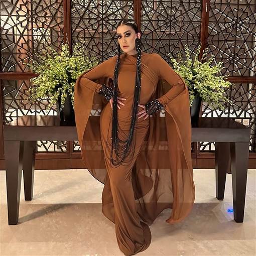 وفي الإطلالة الثانية، بنفس تسريحة الشعر والمكياج، ارتدت Cape بني طويل مزين باكسسوار طويل معلق بين الأذنين.