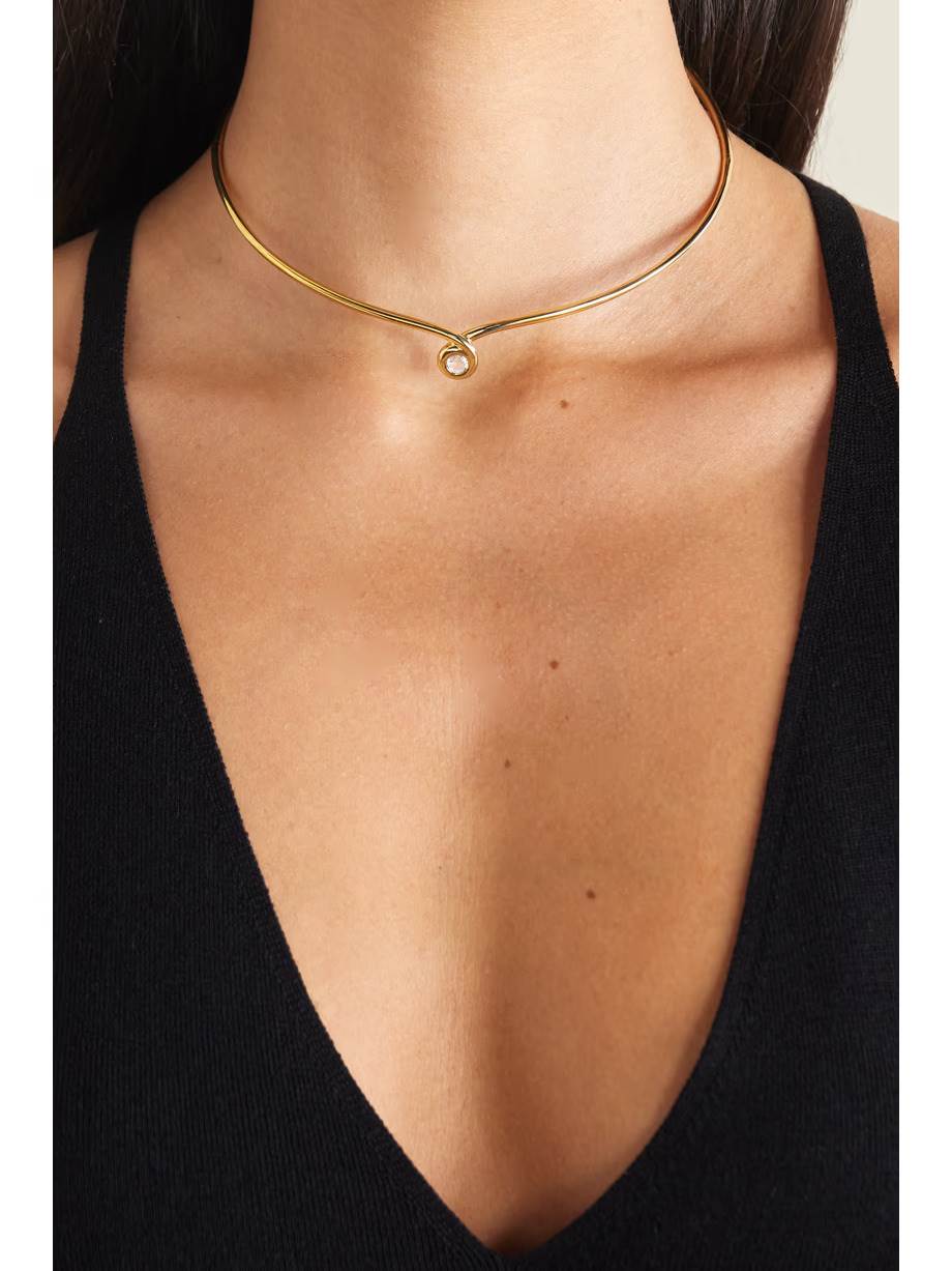 يتجسد في هذا العقد مزيج متناغم بين الفخامة والحداثة، فقد تم صنعه من الذهب عيار 14 قيراطًا، ويضم في مركزه حجر Swiss Blue Topaz يزن 8.84 قيراط، محاطًا بلمسات رقيقة من الألماس المرصوف بوزن إجمالي 0.14 قيراط، وتُعلق هذه التفاصيل الأنيقة على شريط فاخر من المخمل الأسود، مما يضفي تباينًا لافتًا بين القوام والخامات، ويُعد هذا التصميم خيارًا مثاليًا لإضافة لمسة درامية وأنيقة إلى إطلالات السهرات.