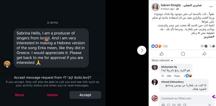 نشرت صابرين النجيلي صورة لرسالة وصلت لها من منتج اسرائيلي يعرض عليها تحويل أغنيتها "إنت مين" للعبرية، مثلما تم تحويلها لليونانية، وردت عليه كاتبة: "عفواً .. انت بالنسبه لى مش موجود ولا بلدك موجوده وربنا الغنى والرازق بعيد عن اي استفاده ماديه لو منكم مش عيزاها، اغنية انت مين الحمد لله نجحت في مصر واترجمت يونانى وقريب في بلغاريا .. ومرحبا بأي بلد .. بلد حقيقيه مش ai زيكم".