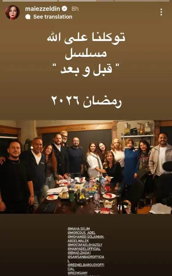 وشاركت مي جمهورها صورة من كواليس اليوم الأول للتصوير عبر خاصية "الستوري" على "إنستغرام"، ظهرت خلالها مع فريق العمل، وعلّقت: توكلنا على الله.. مسلسل قبل وبعد 2026، مؤكدة جاهزيتها لخوض التجربة الجديدة.