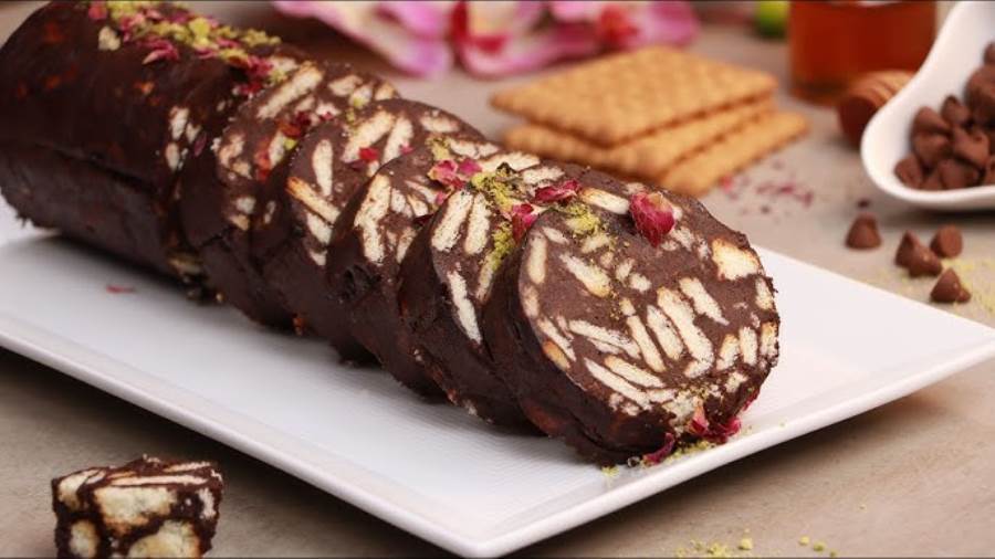- شكّلي المزيج لشكل أسطواني داخل ورق الزبدة والأولمنيوم أو حسب الرغبة، ثم احفظيه داخل الثلاجة لمدة 5 ساعات أو ليلة كاملة، ثم قطّعيه وقدميه بارداً.