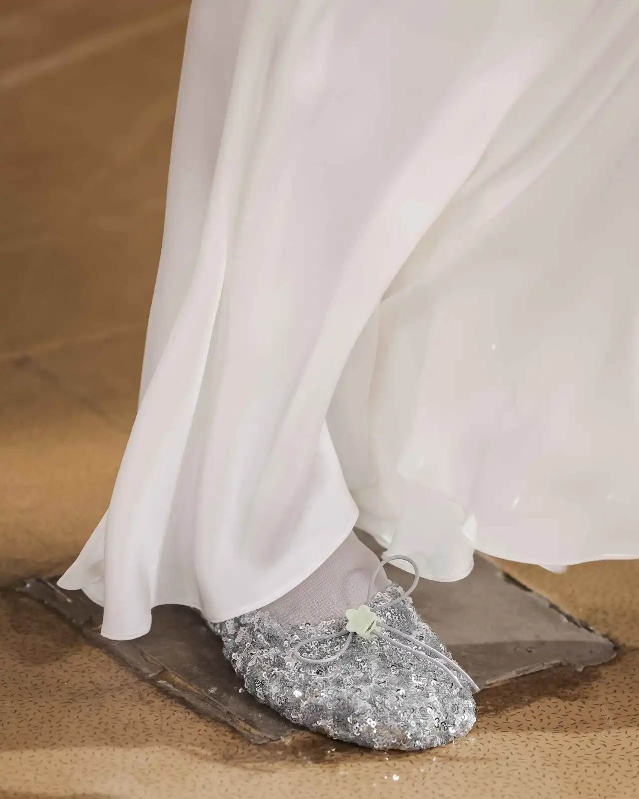 إذا كنتِ تبحثين عن حذاء مسطّح مريح ترتدينه طوال يوم الزفاف، ويضفي لمسة عصرية على فستانك، فاختاري باليرينا مرصّعة بالترتر باللون الفضي لتمنحك لمسة فاخرة تليق بإطلالتك وتعكس أسلوبًا أنيقًا ومواكبًا للموضة، كما تضيف هذه التفاصيل اللامعة بعدًا لافتًا يضيء فستان الزفاف ويمنحه حضورًا ناعمًا من دون مبالغة.