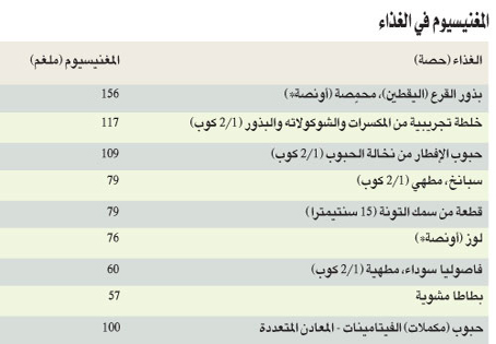 ويحتاج الرجل البالغ إلى تناول نحو 420 ملغم من المغنيسيوم يوميا، بينما تحتاج المرأة إلى 32 ملغم منه. ومن سوء الحظ فإن غالبية الأميركيين يعانون من نقص المغنيسيوم . وقد أظهر مسح لوزارة الزراعة الأميركية تحت عنوان: «ما الذي نأكله في أميركا؟» أن الرجال يتناولون مقادير تقل عن 350 ملغم يوميا والنساء 260 ملغم يوميا في المتوسط، من المغنيسيوم .